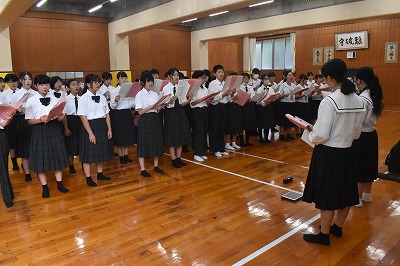 2025年10月2日 17時00分 今日は、朝の時間に全校合唱練習を行いました。全校合唱「南風」は、これまで、南部中が伝統的に歌い続けてきた大切な曲です。歌詞の意味や、歌い続けてきた意味を、3年生の合唱リーダーが後輩に伝え続けてきたことによって、今でも歌い継がれています。今年はどんな「南風」が完成するのか楽しみです。