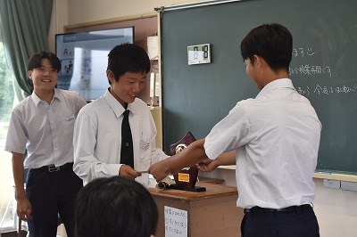 先輩が後輩へ感謝状を渡すワンシーン。南中祭が終わり、群団活動も一段落しましたが、体育大会や南中祭の出店活動に協力してくれた後輩に感謝の気持ちを伝えていました。先輩と後輩の間に生まれた深いつながりを感じます。