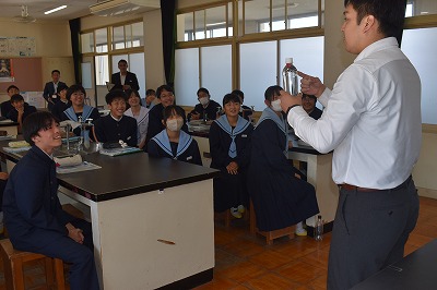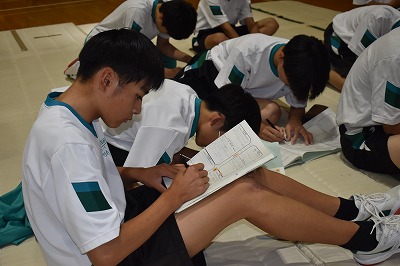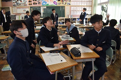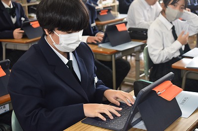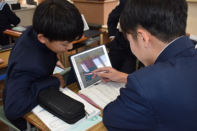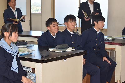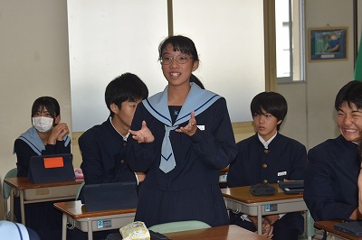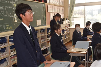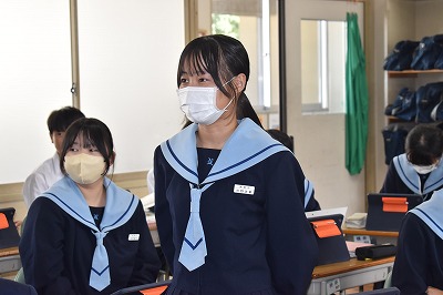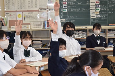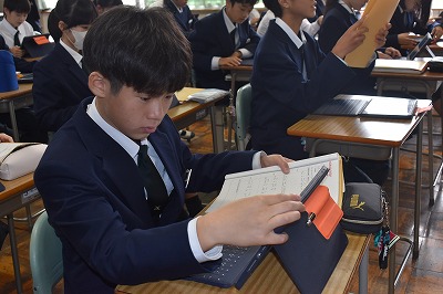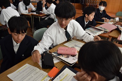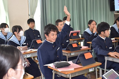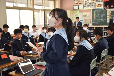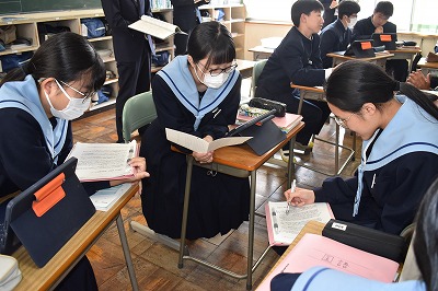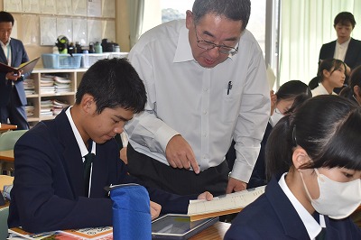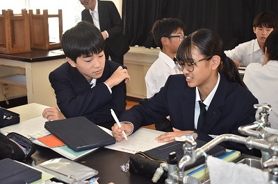 今日は、西三河教育事務所と幸田町教育委員会のかたにお越しいただき、生徒が授業に臨む姿を見ていただきました。1人1台端末を使って考えを整理したり、疑問に思ったことをグループで話しあったりするなど、生徒が意欲的に学ぶ姿を、多くの場面で見ることができました。