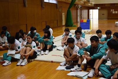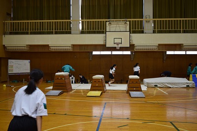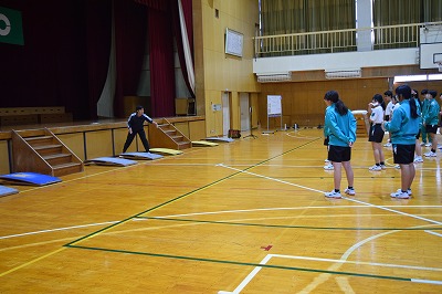 今日は、2年3組の生徒が、保健体育の授業で跳び箱に取り組みました。はじめに、助走で減速しないように歩幅を合わせることを意識しました。その後は、着地で体勢を整えてかかとからつけるように体の使い方を工夫して跳ぶことができました。