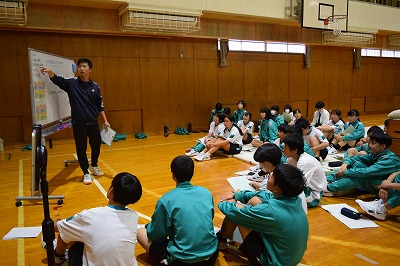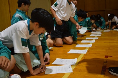 2025年10月28日 17時00分 今日は、2年3組の生徒が、保健体育の授業で跳び箱に取り組みました。はじめに、助走で減速しないように歩幅を合わせることを意識しました。その後は、着地で体勢を整えてかかとからつけるように体の使い方を工夫して跳ぶことができました。