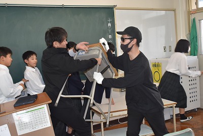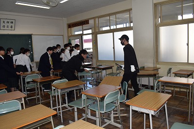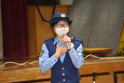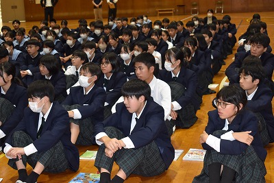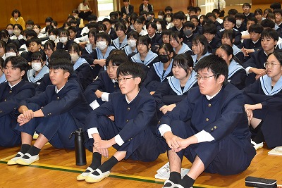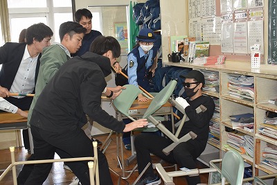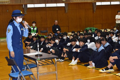 今日は、1年3組に不審者が侵入したという想定で、不審者避難訓練を実施しました。生徒らは速やかに体育館に避難することができました。不審者が教室に侵入した際は、不審者を教室から外に出さないことや、不審者が持つ刃物を早めに叩き落すことなどを岡崎警察署のかたから教えていただきました。生徒は、自分の身は自分で守ることを心がけるようにご指導いただきました。