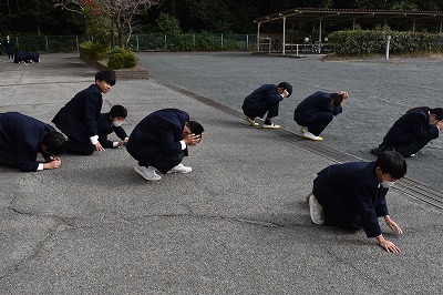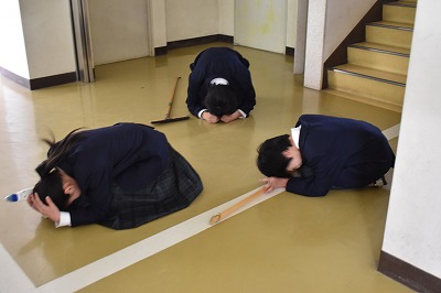 2025年11月11日 17時30分 今日は、予告なしの避難訓練を実施しました。さらに、避難中に余震が発生したという想定で行いました。生徒は、自分で状況を判断し、避難するためのドアを開けてからシェイクアウトの姿勢をとったり、窓ガラスから遠ざかってから机の下に頭を隠したりしました。