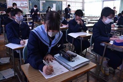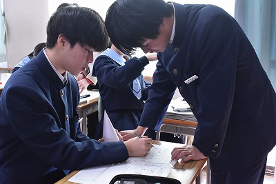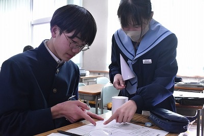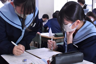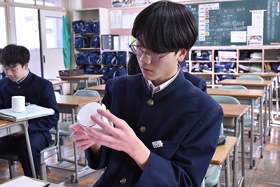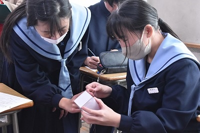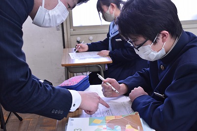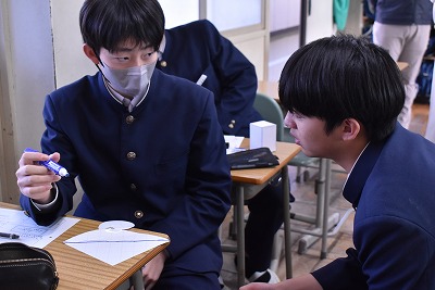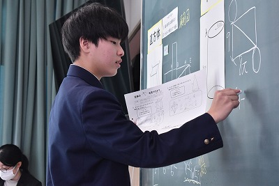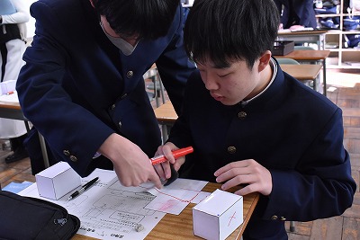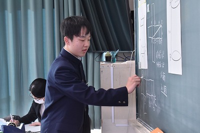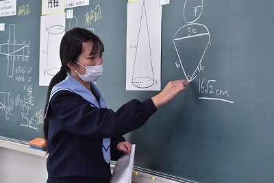 2025年12月16日 18時00分 本日、3年2組で数学の授業研究が行われました。立体の側面を通るひもの長さを求める問題でした。見取り図から展開図にすることで、点と点を結ぶ最短距離を見つけ、三平方の定理を使って求めることができました。立体模型を眺めながら、試行錯誤し答えを導きだそうとする意欲の高さには驚かされました。