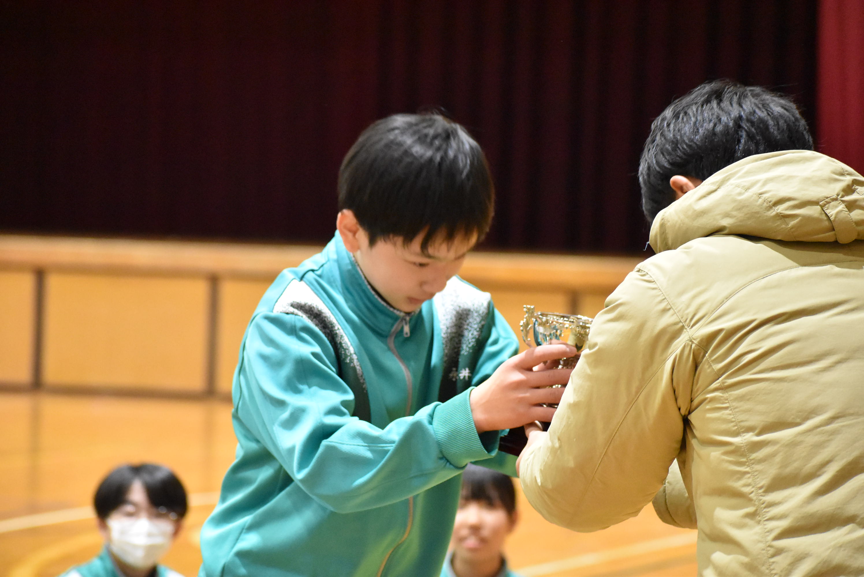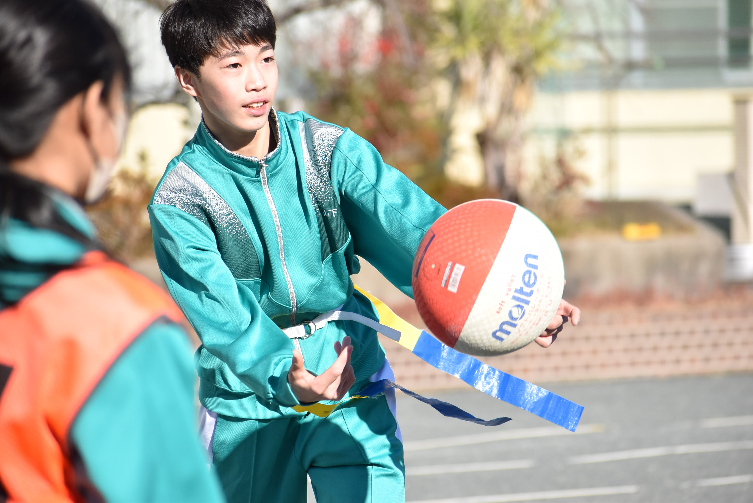 2025年12月22日 17時00分 本日、2年生が球技大会を行いました。ソフトバレーボールとフラッグフットボールの二種目に分かれて競技を行いました。どのチームも優勝トロフィー獲得をめざして一生懸命取り組んでいました。結果1~3位まで2点差の接戦で3組が優勝しました!3組おめでとうございます!今学期も残り1日!気を抜かず、頑張りましょう。