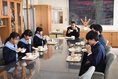 2026年1月19日 17時00分 卒業を前に、3年生は校長先生との会食をスタートしました。普段、なかなか入ることのない校長室での給食は、いつもとはひと味違う楽しい時間となったのではないでしょうか。今まで、日課のひとつにすぎなかった給食も、実は貴重な時間だったと感じると思います。残り少ない給食をぜひ味わって食べてほしいと思います。