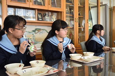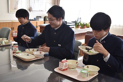 卒業を前に、3年生は校長先生との会食をスタートしました。普段、なかなか入ることのない校長室での給食は、いつもとはひと味違う楽しい時間となったのではないでしょうか。今まで、日課のひとつにすぎなかった給食も、実は貴重な時間だったと感じると思います。残り少ない給食をぜひ味わって食べてほしいと思います。