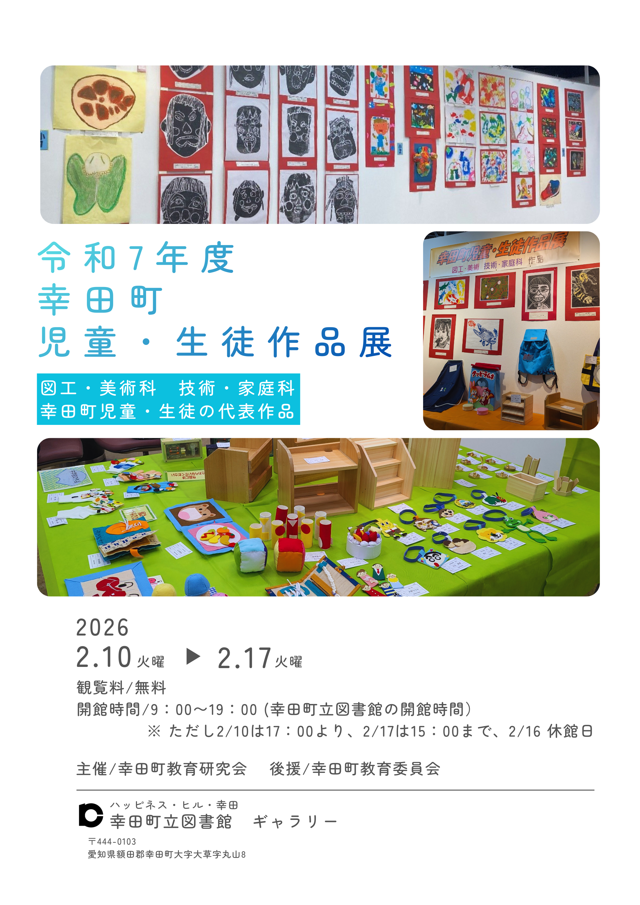 令和7年度幸田町児童・生徒作品展(2/9)R8 2026年2月9日 17時00分 明日の17:00から17日(火)15:00まで、町の図書館にて生徒作品が展示されます.町内の代表生徒の作品が展示されますので、ぜひ見に行ってみて下さい。詳しくは、先日お配りしたチラシをご確認ください。