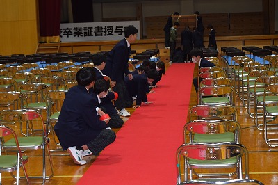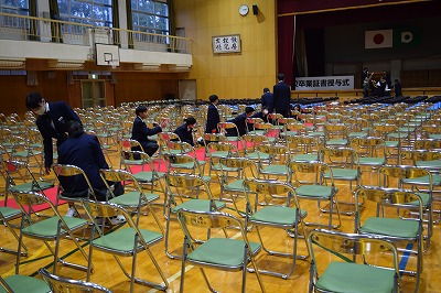 本日、1,2年生が午後から卒業式の会場準備をしました。明日から、3年生は卒業式の練習が始まります。床に敷かれた赤じゅうたんやきれいに並べられたパイプいすを見ると、3年生はようやく、卒業が近づいていることを実感すると思います。卒業式で3年生が立派な姿を見せてくれることを、今から楽しみにしています。