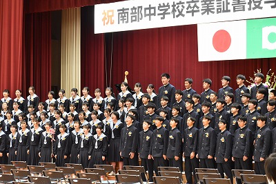本日、第43回卒業証書授与式が挙行され、99名の生徒が南部中学校を巣立っていきました。卒業生は、これまでの感謝とともに義務教育の集大成としての姿を示すことができました。